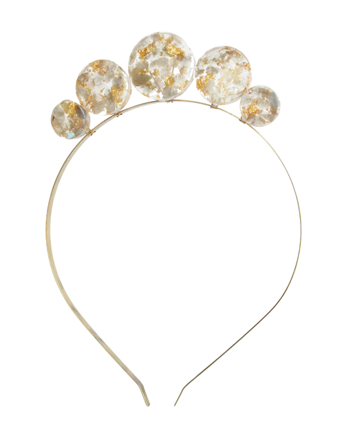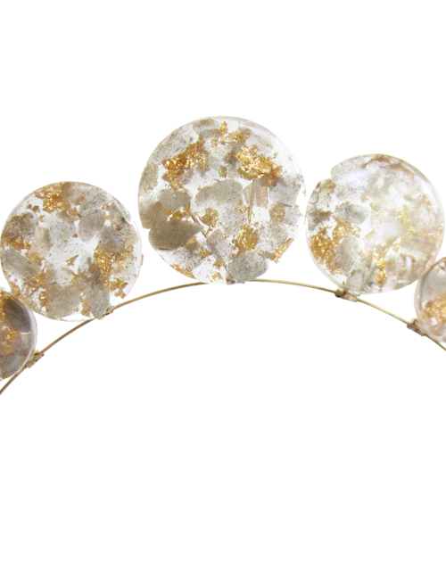 Description: This crown includes a nickel and lead free alloy metal headband and brass fixtures with resin artwork, stone chips, and metal flakes.