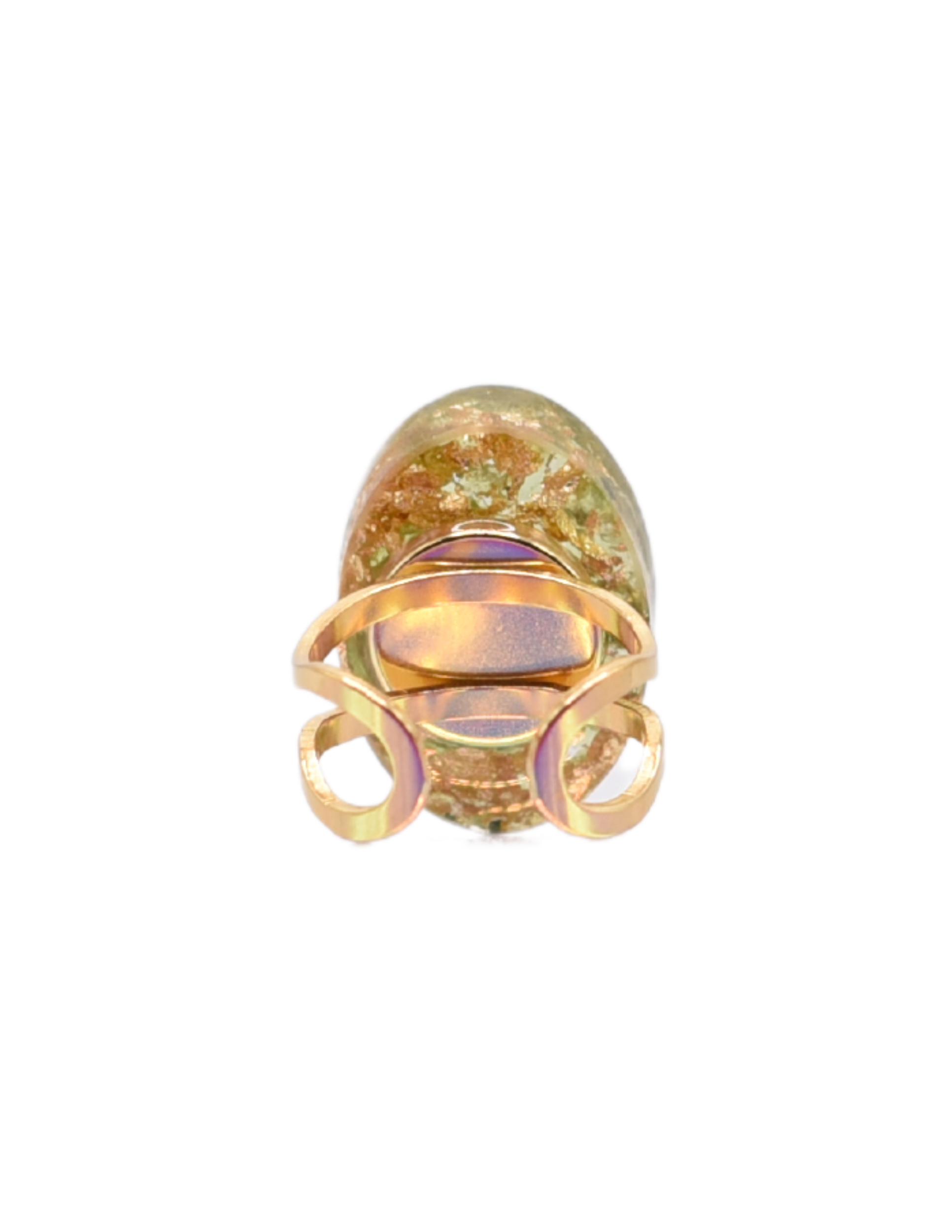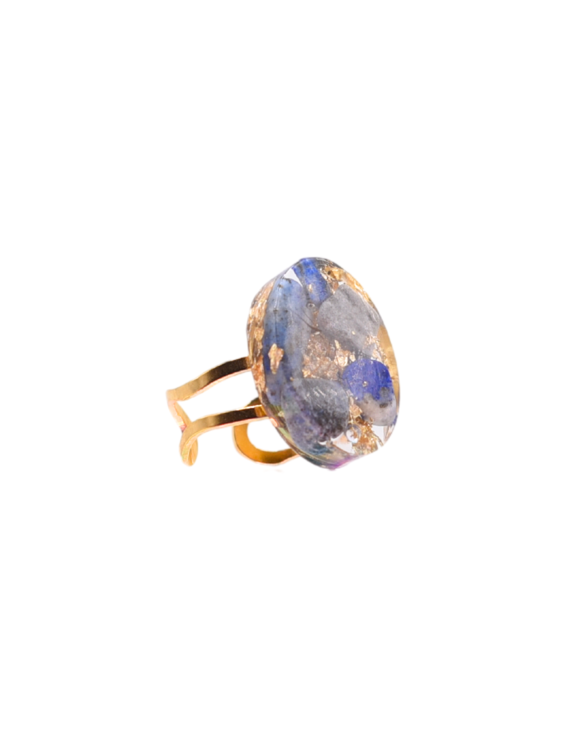 Description: This ring includes resin artwork with stones and metal flakes. The metal band is adjustable.